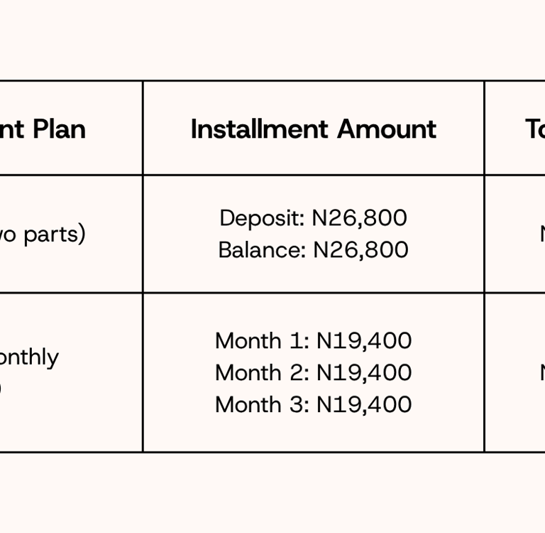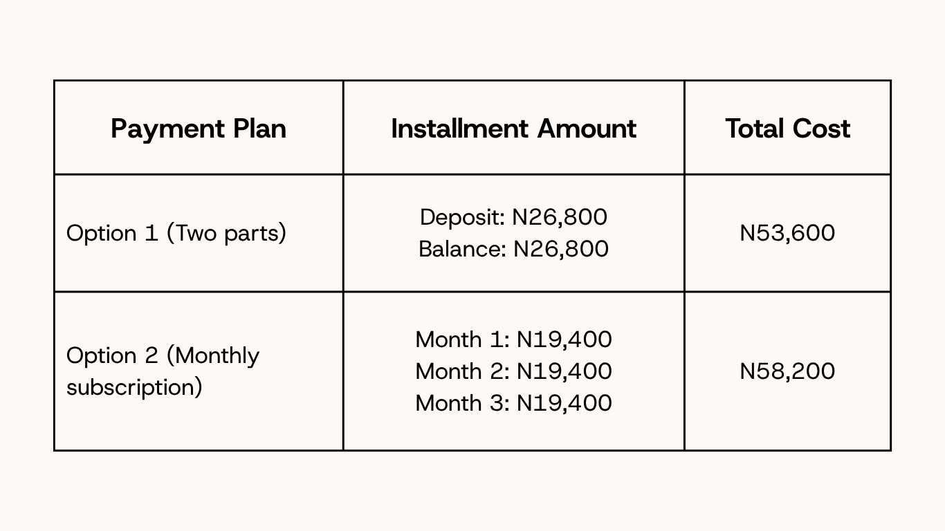 Absolutely! A payment plan for the course is available if you want to pay in two or three installments, though the total cost increases from the standard rate of N49,500.