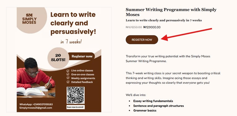 Moses founded Simply Moses after realising that while many Nigerian job applicants had great ideas, they lacked the fundamental writing skills to articulate them professionally. This course is his solution: a highly focused, one-on-one mentorship programme designed to close that skill gap and move you from beginner to job-ready writer in 90 days.