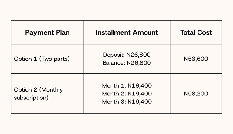 A payment plan for the course is available if you want to pay in two or three installments, though the total cost increases from the standard rate of N49,500.